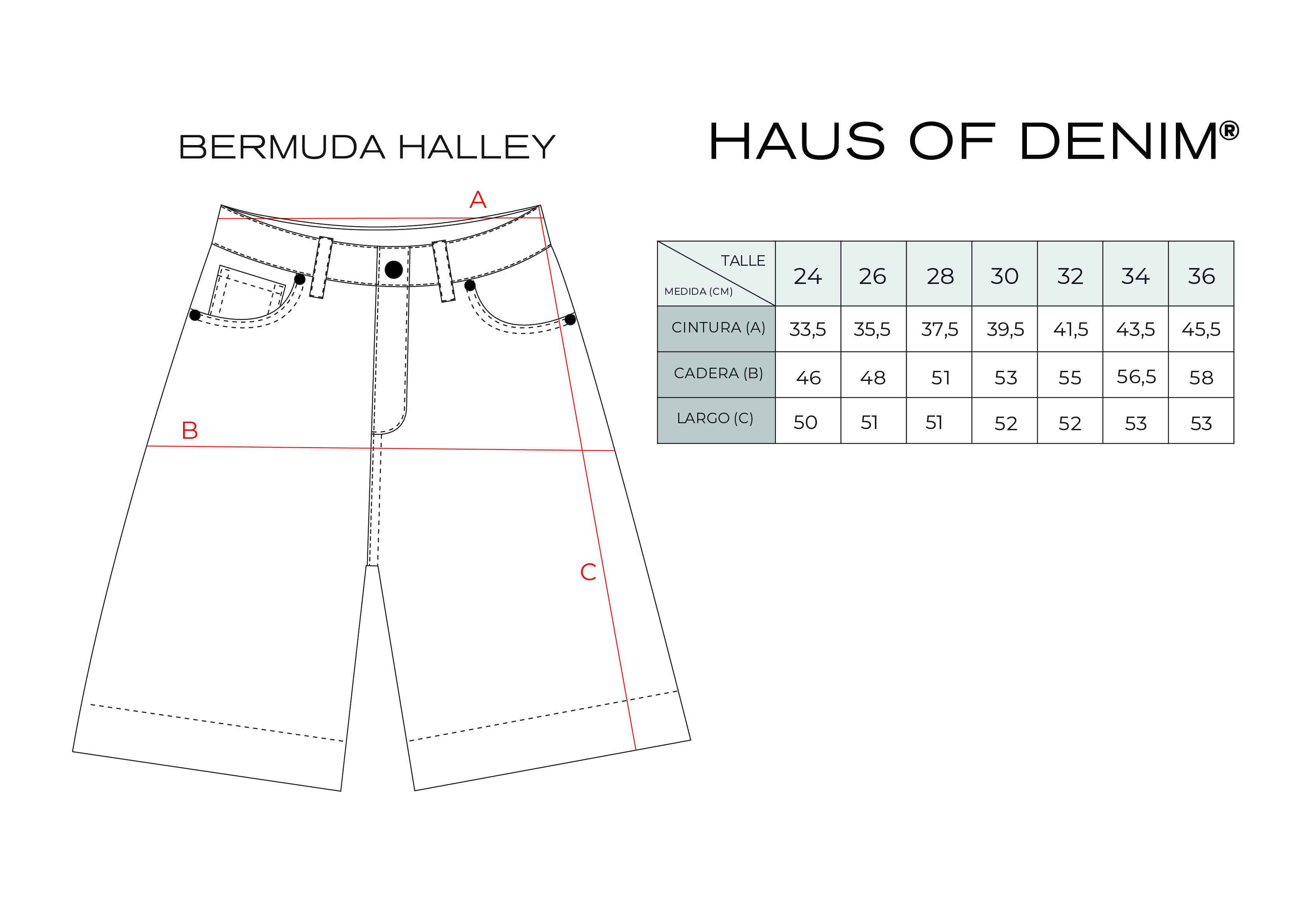 Bermuda tiro alto con estructura de jean 5 bolsillos. La línea de sus piernas es A. La cintura acompaña a la forma de figura y a la altura de la cadera se va despegando hasta llegar a una línea A a la altura de la bota que cae justo por encima de la rodilla.
