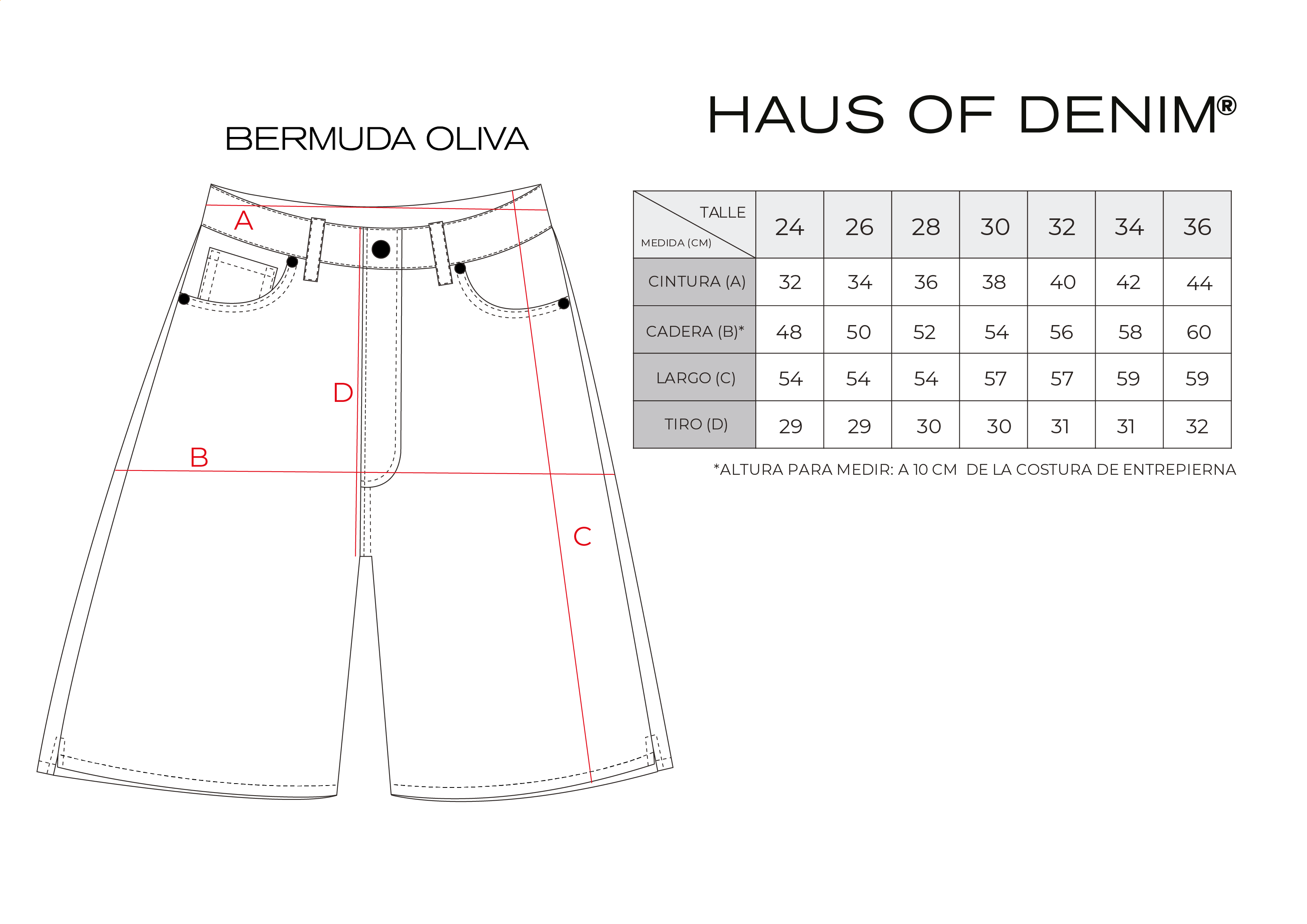 Bermuda de denim rígido en un tono verde oliva seco. Un ítem 100% jeanero y de tendencia. De calce 5 bolsillos, tiro alto y pierna recta. Con un detalle de bota a la corte en línea oblicua que estiliza y favorece a la pierna.