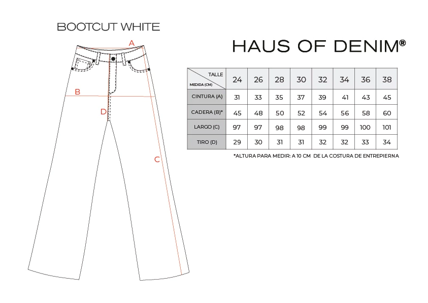 Calce 5 bolsillos de tiro alto y pierna recta con pequeña amplitud en bota. Súper elegante. Su largo tobillero destacado por un des dobladillado artesanal en bota le da ese toque canchero y relajado. El jean blanco optico, con hilos al tono que se alinea a cualquier look sofisticado o informal. Al Ser de pierna recta y largo al tobillo permite el uso de zapatillas, botas o sandalias.