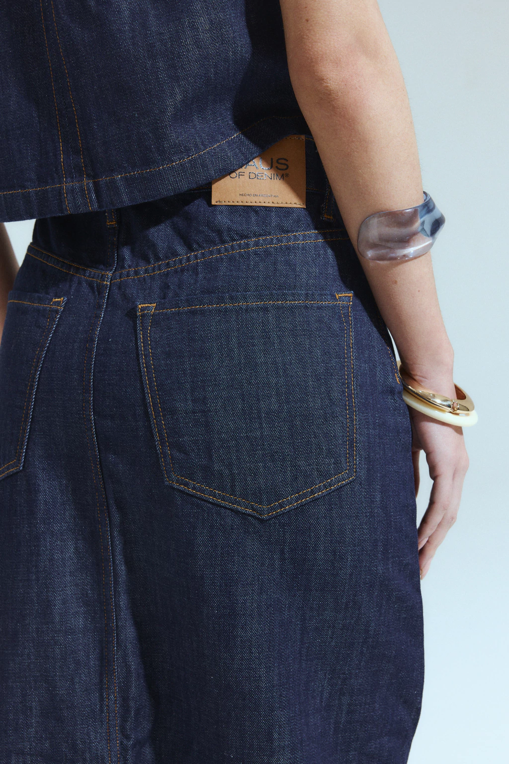 Detalle en cintura de prendedura cruzada, recurso de tendencia que le da un sello actual y canchero a una prenda tan icónica y conocida.